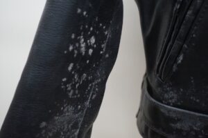 ご覧の様なカビは、閉め切ったクローゼットにしまい込むと、思ったより短期間でついてしまいます。