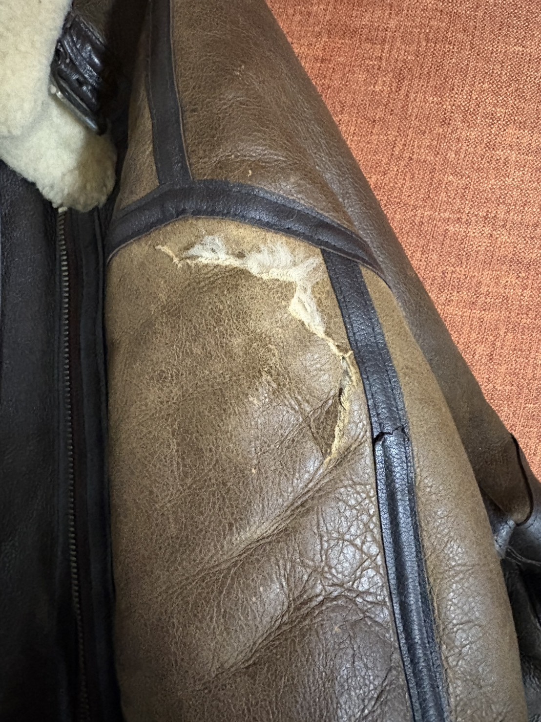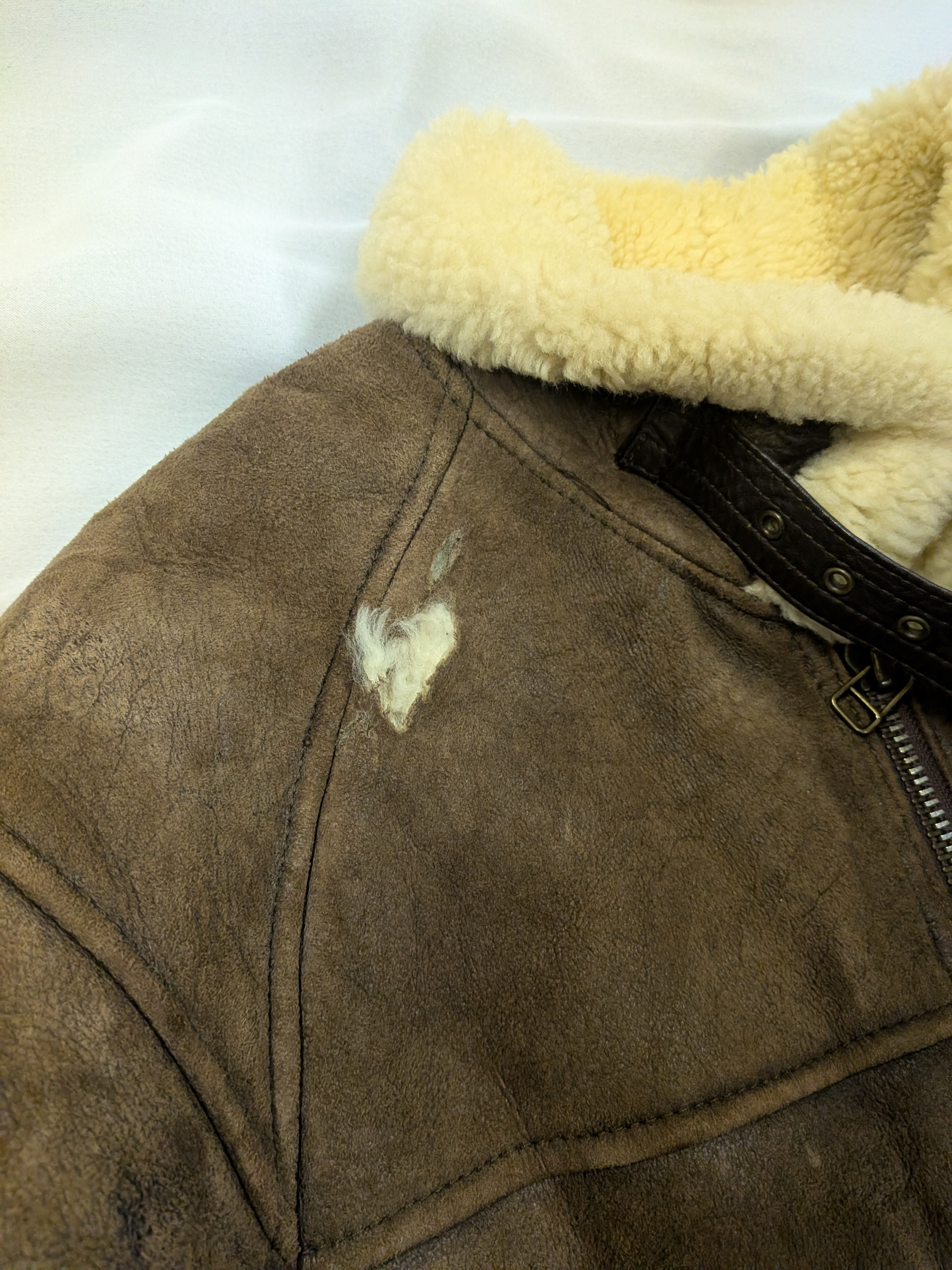 シープスキンジャケットの破れを修理しました。詳細はHP内「革修理ブログ」を御覧下さい!